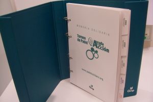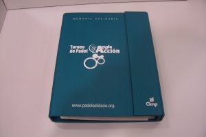 • Carpeta de anillas mixtas con cierre en cruz imantado, impreso a 2 colores en cubiertas y 1 en las guardas sobre papel estucado mate de 170 gr., con plastificado mate y contracolado a cartón compacto de 20 micras.